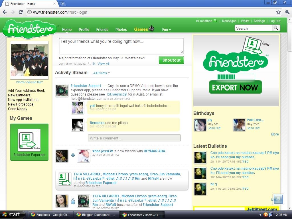 L’obiettivo di Friendster era far incontrare persone, che si conoscono nel reale, in un ambiente virtuale sicuro in cui si potevano condividere i profili personali. Friendster raggiunse in poco tempo i 3 milioni di utenti guadagnando anche l’attenzione della stampa.