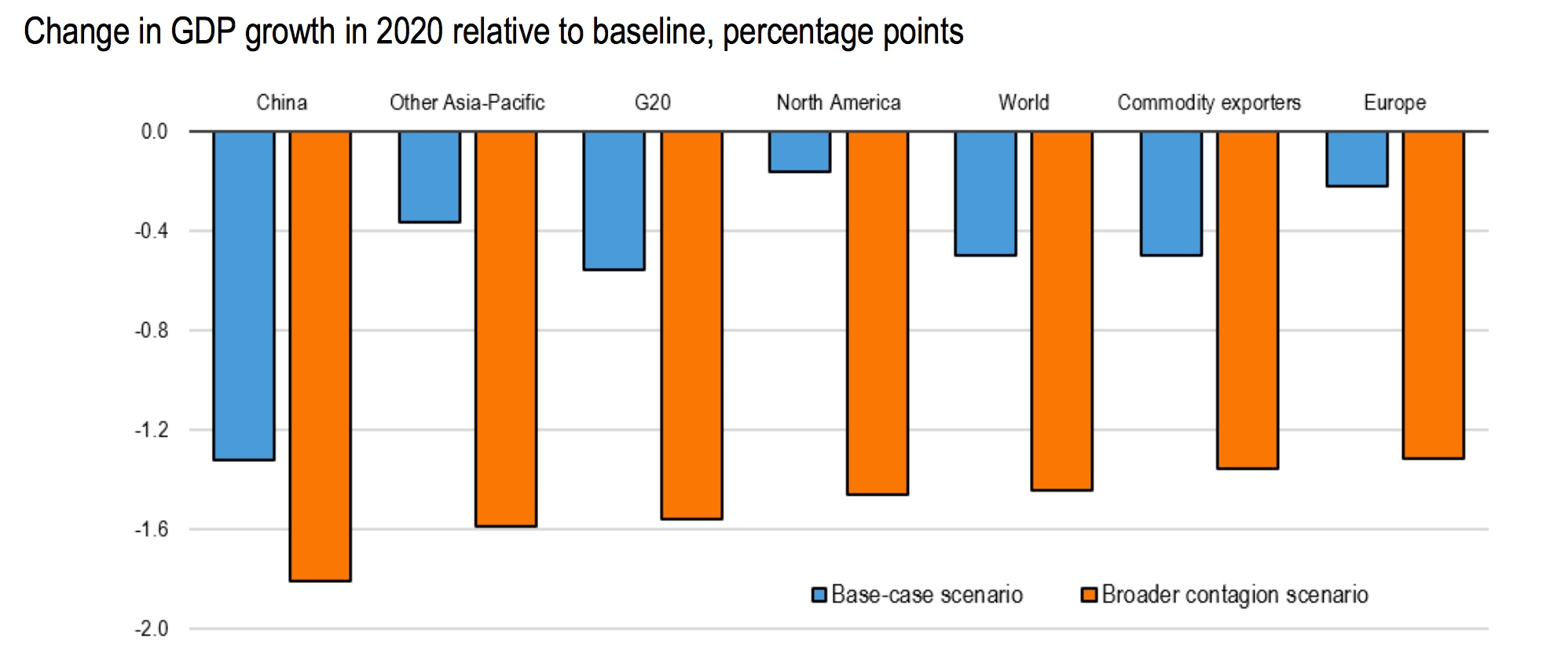 Per il 2020 le previsioni non sono incoraggianti: l’OCSE prevede, in un doppio esercizio statistico considerando due scenari di diffusione del virus (ottimistico e pessimistico), una depressione dell’economia diffusa che sfiora una crescita negativa di quasi il 2% per il PIL della Cina.