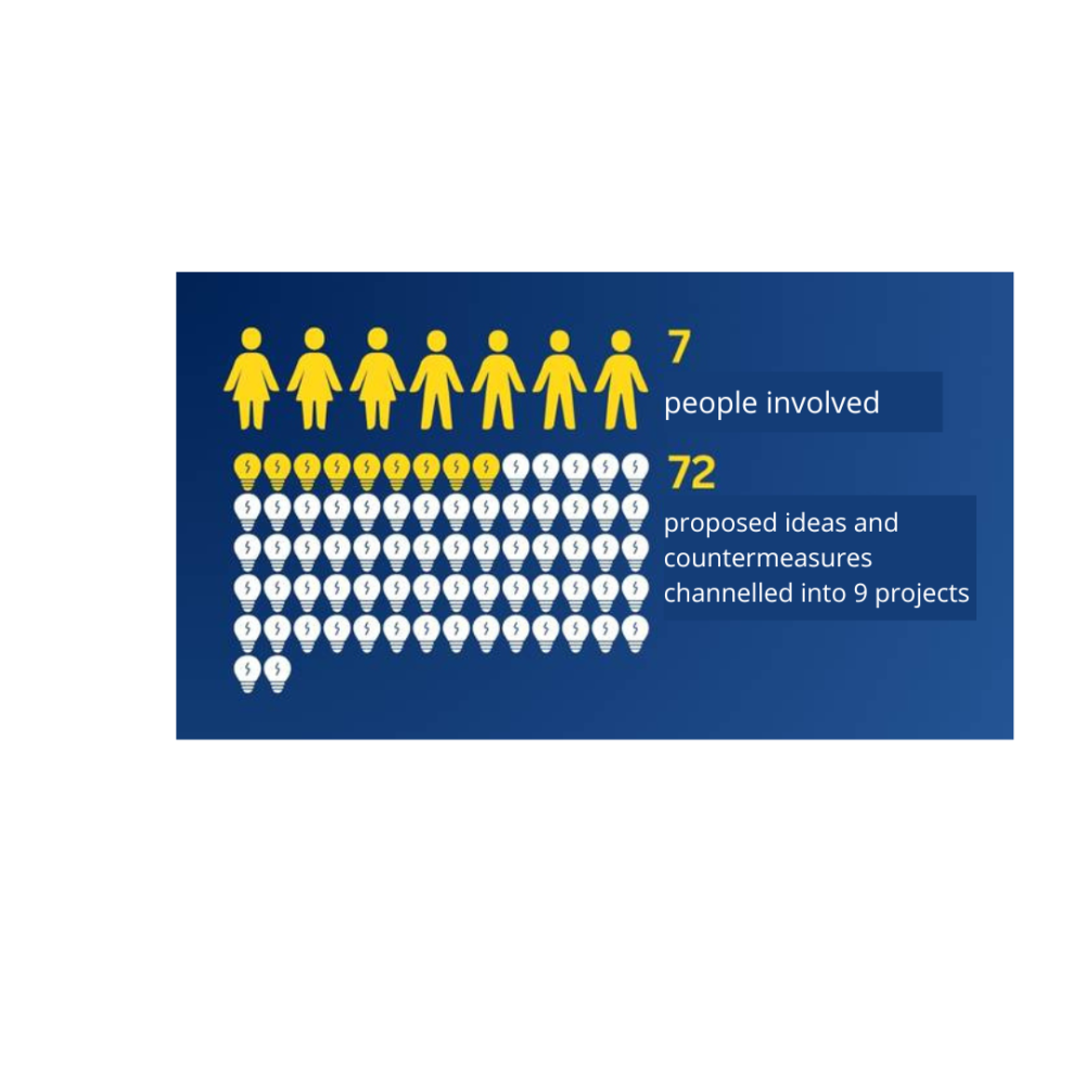 The rest of the company’s population was also involved and questioned in the analysis, on which the members of the Project Team generated countermeasures (72 ideas to a first count), subsequently channeled into 9 sites each led by a member of the Project Group.